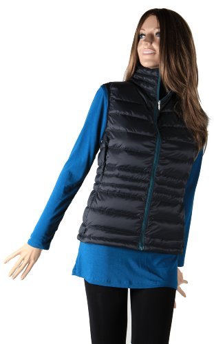 Gilet en duvet ultra léger pour femmes, garni de duvet d'oie 95/5, 750 Fill Power, poids total d'un gilet taille M : 165 g. Largeur du bas réglable par un élastique, emmanchures bordées d'un passepoil. Col montant piqué. Fermeture à glissière YKK sur le devant de couleur turquoise foncé en contraste avec le gilet. Poches intérieures des deux cotés, poches extérieures munies de fermetures à glissière et de coutures non apparentes. Matière : 100% nylon, duvet et tissu résistants à l'eau. La coupe est suffisamment souple pour pouvoir porter un pull sous le gilet. La forme cintrée du gilet est accentuée par les parties surpiquées plus étroites au niveau de la taille. Parties surpiquées à l'avant et à l'arrière. Veuillez noter les mesures suivantes : Largeur de poitrine M=52cm, L=54cm, XL=56cm, XXL= 58cm, XXXL= 60cm ; Largeur du bas M=55cm, L=57cm, XL=59cm, XXL=61cm, XXXL=63cm